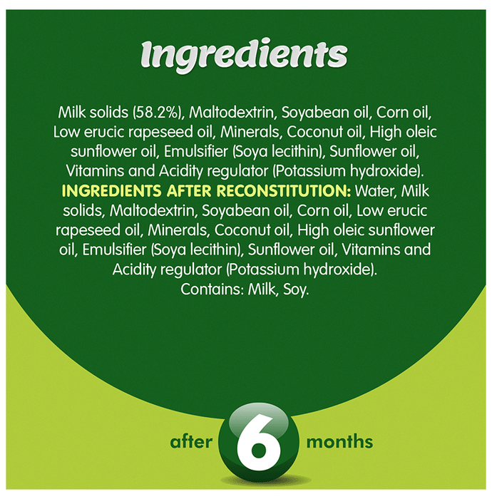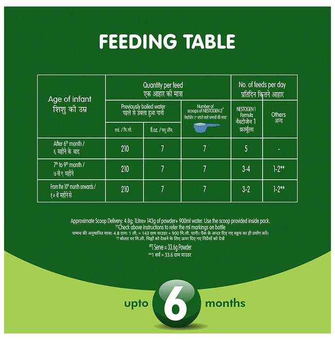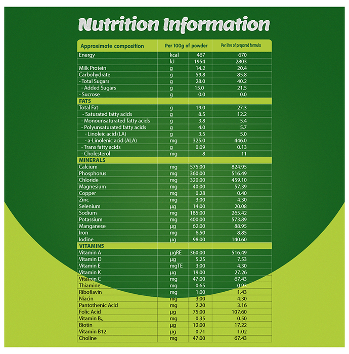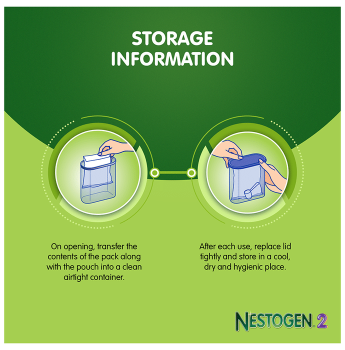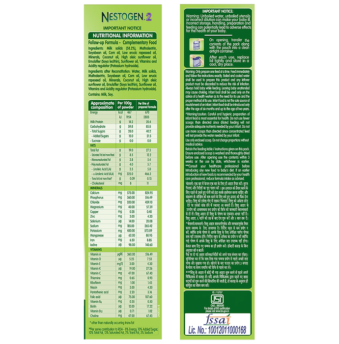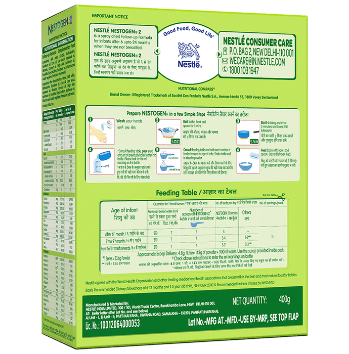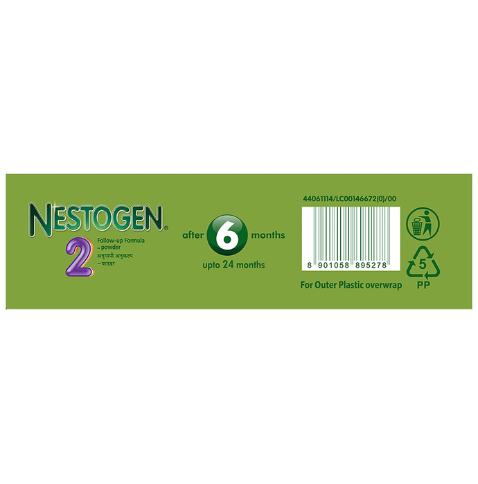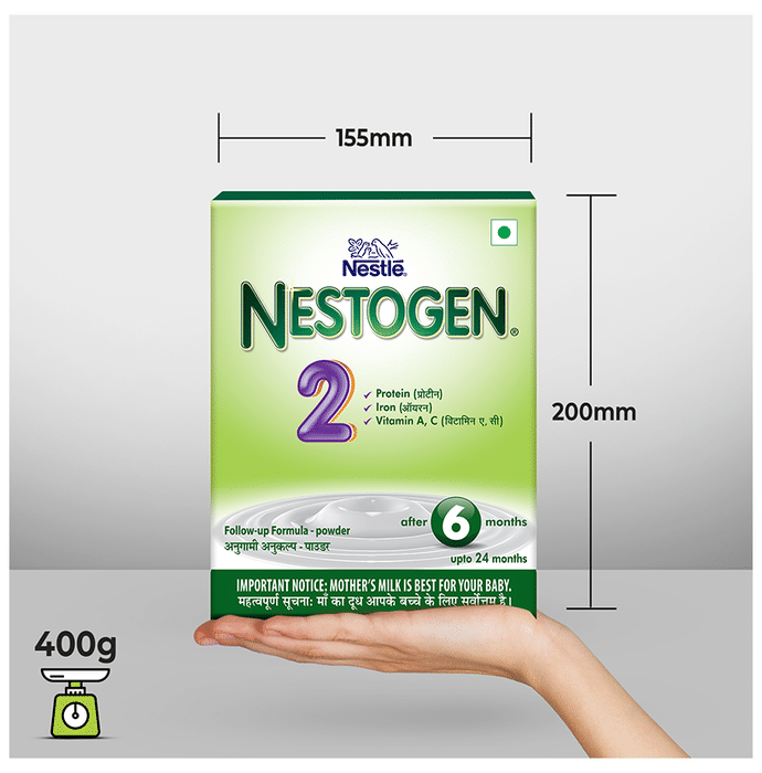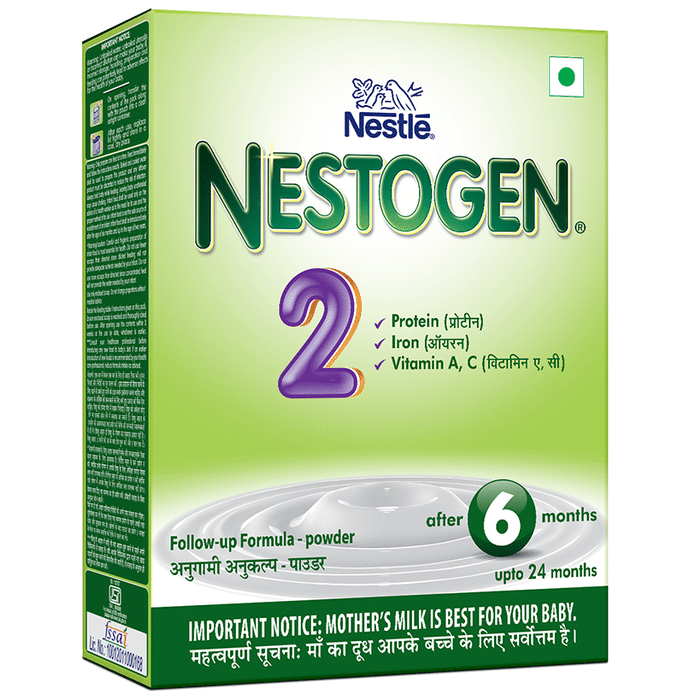 Nestle Nestogen 2 Follow-Up Formula-Powder (After 6 Months) in the net quantity of 400gms, is formulated to suit the growing nutritional requirements of your little one (babies between 6 months and 1 year – when not breastfed). It contains age-appropriate levels of all essential nutrients such as Protein, Minerals, Carbohydrates, Fats, Vitamins that help strengthen the body, boosting its energy levels. This follow-up infant formula contains Maltodextrin, making it easily digestible. It is also extremely delicious, making it the perfect diet for your little one. | Key Ingredients: Milk solids (51.8%), Maltodextrin, Dried Glucose Syrup, Oil mix (Low erucic rapeseed oil, coconut oil, High oleic sunflower oil, Antioxidant (L-Ascorbyl Palmitate and Acidity regulator (citric acid))), )Soyabean oil, Corn oil, Minerals, Emulsifier (Soya lecithin), Vitamins and Acidity regulators (Potassium hydroxide and Citric acid) INGREDIENTS AFTER RECONSTITUTION: Water, Milk solids, Dried glucose syrup, Oil mix (Low erucic rapeseed oil, coconut oil, High oleic sunflower oil, Antioxidant (L-Ascorbyl Palmitate and Acidity regulator (citric acid) ,Soyabean oil, Corn oil, Minerals, Emulsifier (Soya lecithin), Vitamins and Acidity regulators (Potassium hydroxide and Citric acid) Minerals: Sodium citrate, Calcium citrate, Potassium phosphate dibasic, Sodium chloride, Magnesium chloride, Ferrous sulphate, Zinc sulphate, Cupric sulphate, Manganese sulphate, Potassium iodide and Sodium selenite Vitamins: Sodium ascorbate, dl-alpha-tocopheryl acetate, Nicotinamide, Calcium pantothenate, Thiamine mononitrate, Pyridoxine hydrochloride, Riboflavin, Retinyl acetate, Folic acid, Phytylmenaquinone, d-Biotin, Ergocalciferol and Cyanocobalamine Carrier: Glucose syrup and Maltodextrin | Key Benefits: Contains essential nutrients such as Proteins, Minerals, Carbohydrates, Vitamins, etc that help in the overall healthy growth and development of the baby Calcium and phosphorus help in the strengthening of the bones Choline, Taurine, Folic Acid help in improving the brain functioning and ensure its healthy development Easily digestible and extremely delicious | Directions For Use: Use as directed. | Safety Information: Read the label carefully before use Store in a cool and dry place away from direct sunlight Keep out of reach of the children