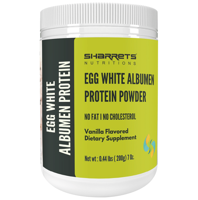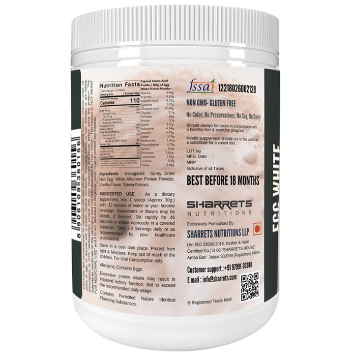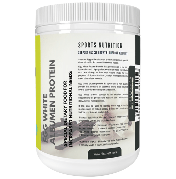 Sharrets Egg White Albumen Protein Powder is a special dietary food to increase Nutritional needs. Egg white protein is a pure ingredient, a high-quality protein that contains all essential amino acids needed by the body. | Key Ingredients: Desugared spray dried hen egg (white) Albumen Protein Powder. | Key Benefits: Provides all essential amino acids needed by the body A good protein alternative for people with lactose intolerance since its lactose-free This powder contains no cholesterol, no fats, soy and GMO Ensures muscle building and improves mental fatigue during performance No added vitamins, minerals and growth hormones Excellent protein supplement for those who can’t eat meat or dairy products Substitute for egg whites in baking recipes | Directions for Use: To supplement your diet with additional protein add 1 scoop (30g servings) to 12 oz water, milk, vegetable juice or your favourite mixture. Use 2-3 times daily. | Safety Information: Read the label carefully before use Keep out of the reach of children Store in a cool dry place, away from direct sunlight