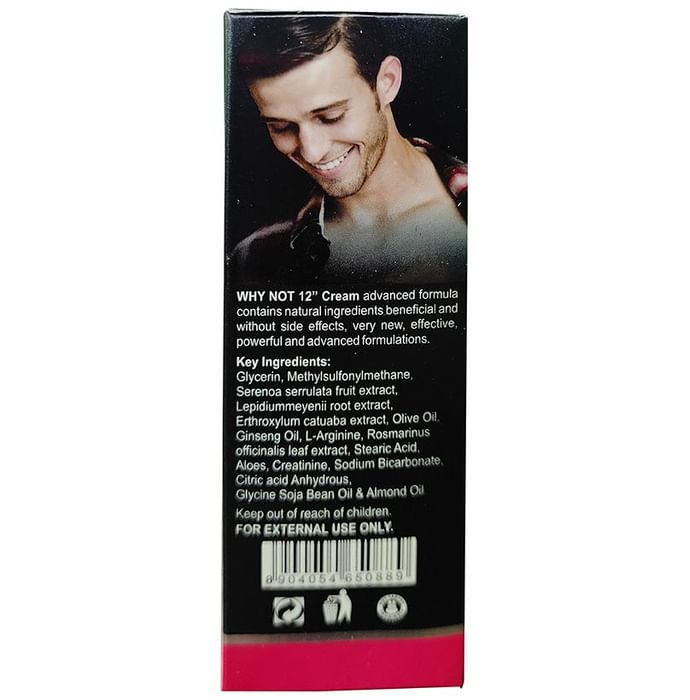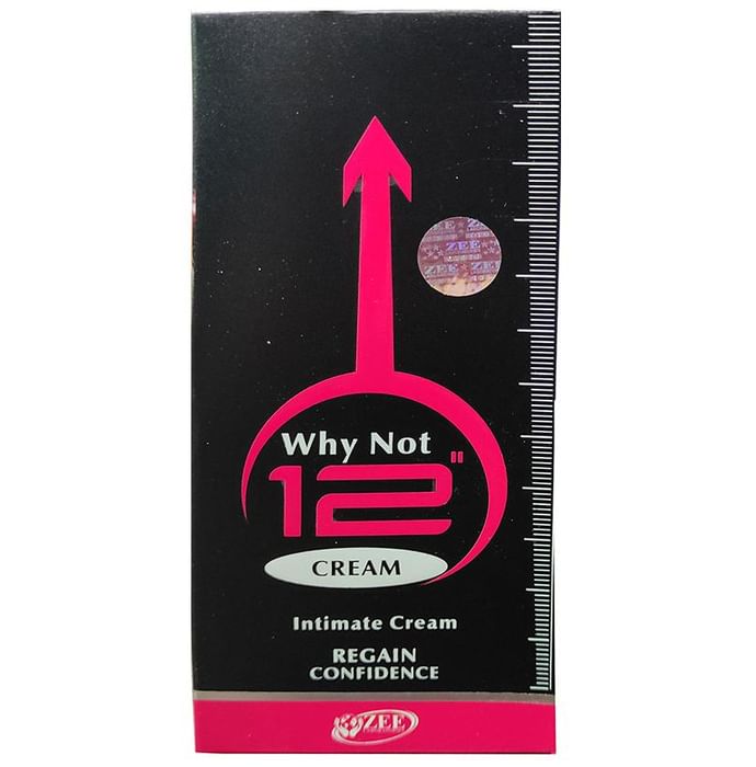 Zee Laboratories Why Not 12 Intimate Cream contains multiple herbal extracts that encourage blood flow to the penis. It helps in increasing the number of Sperms for more lasting pleasure. The product is also used to increase Girth and Thickness. | Key Ingredients: Ashwagandha extract Glycine Soya Bean Oil Searic Acid Sodium Bi Carbonate Citric Acid Aloes Serenoa Serrulate extract Lepidiummeyenii Root extract Erthroxylum Catuba Extract Rosmarinus Officinalis Leaf Extract | Key Benefits: Increases the number of Sperms for more lasting pleasure Promotes Blood supply to the Organ | Directions For Use: Take Well n Care Why Not 12 Cream as directed by the physician. | Safety Information: Read the label carefully before use Keep out of the reach of children Store in cool and dry place