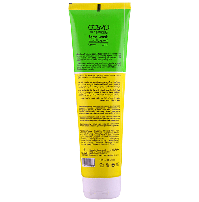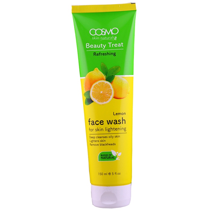 Cosmo Skin Naturals Beauty Treat Refreshing Lemon Face Wash Its unique formula sloughs off dead skin cells and deeply cleanses facial skin by removing dirt, excess oil and blackheads, making your skin smooth, soft and glowing. It is enriched with lemon, an astringent and cooling agent, and aloe vera, which has deep cleansing properties that work together to benefit your skin. | Key Ingredients: Lemon extract Glycerine Potassium hydroxide Myristic acid Aloe vera extract | Key Benefits: Lemon facewash naturally contains vitamin C, an antioxidant that may help reduce skin damage and premature ageing Due to its powerful pH levels, lemon can decrease oil on the skin and reduce inflammation Lemon facewash can naturally lighten the skin, including age spots and acne scars | Directions For Use: Moisten face and neck; apply a small amount of gentle refreshing cosmo facewash and gently work up a lather using a circular motion Wash off and pat dry | Safety Information: Read the label carefully before use Store in a cool and dry place away from direct sunlight Keep it away from the reach of children