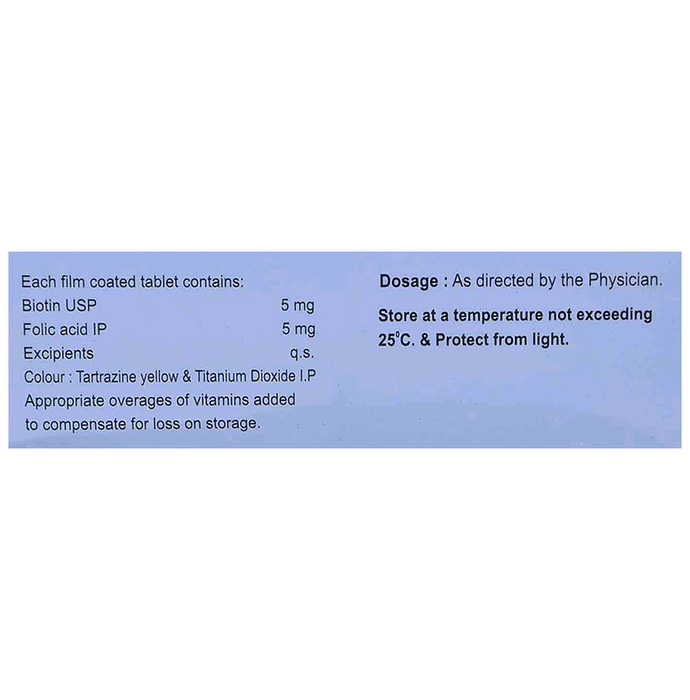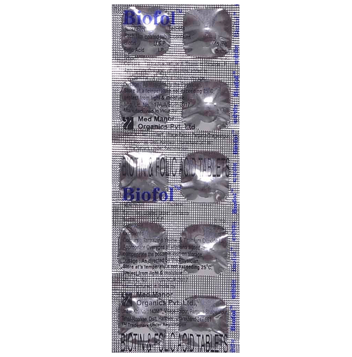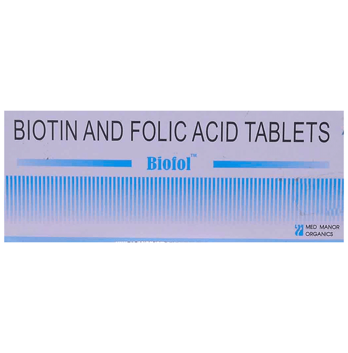 Biofol tablet contains biotin and folic acid. Biotin is vital for cell proliferation which is vital for hair growth. Biotin plays a vital part in producing amino acids which are the building blocks for protein. Hair consists of keratin which is a form of protein. Thus taking biotin supplements helps contribute to hair growth. Folic acid plays an important role in hair growth. It renews the cells that aid the growth of hair. Folic acid deficiency can lead to premature graying and hair loss. Folic acid also helps the body improve its circulation. Healthy circulation helps the skin, skin cells and hair follicles to also be healthy which leads to reduced hair loss and improved hair growth. Biofol tablet is effective in preventing & treating hair loss in men & women. Shows improvement in brittle fingernails. Use under medical supervision
