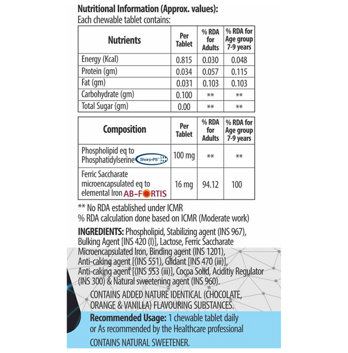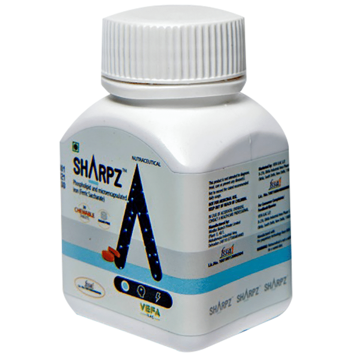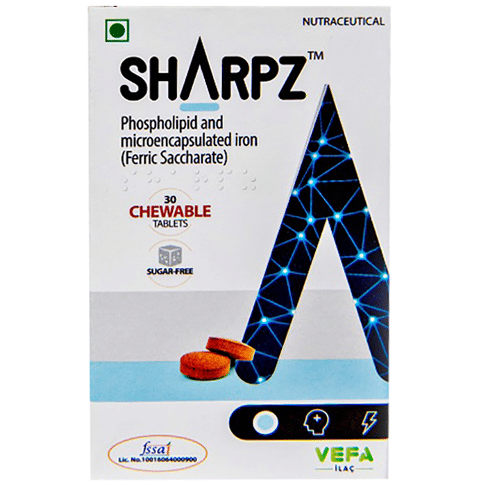 Sharpz Chewable Tablet Sugar Free helps to deal with stress, memory, ADHD and regression. It may help in managing hyperactivity and emotional strain. | Key Ingredients: Phosphatidylserine- 100 mg Microencapsulated iron (ferric saccharate)- 16 mg | Key Benefits: The tablet helps to deal with the sensation of being stressed or unable to deal with mental or emotional strain is known as stress Assists in managing a chronic concerns characterised by difficulties paying attention, hyperactivity, and impulsivity Beneficial in stress, memory, attention deficit hyperactivity disorder (ADHD) and regression | Good to Know: Vegetarian and sugar-free. | Product Form: Tablet. | Directions for Use: Take one chewable tablet daily or as directed by the healthcare professional. | Safety Information: Read the label carefully before use Keep out of reach of the children Use under medical supervision Do not exceed the recommended dose Store in a cool, dry place away from direct sunlight