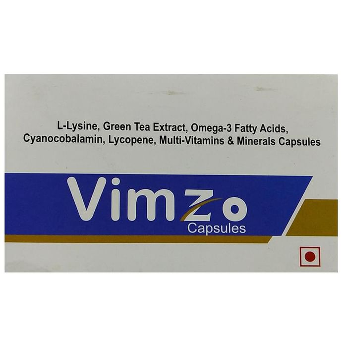 Vimzo Capsule is a health supplement that contains all the natural ingredients to help lower stress or anxiety levels. | Key Ingredients: L-Lysine Green tree extract Omega 3 fatty acids Lycopene Multivitamins and minerls Gynocobalamin | Key Benefits: The presence of multivitamins and minerals helps boost the energy levels to perform daily physical activities Lycopene helps in releasing bad cholesterol while regaining good cholesterol from the body It reduces the inflammation and symptoms associated with inflammatory bowel disease It may help lower some risk factors for cardiovascular disease, promote satiety and weight loss, and prevent obesity Multivitamin helps in reducing stress and anxiety | Directions for Use: As prescribed by the physician | Safety Information: Read the label carefully before use Store in a cool and dry place, away from sunlight Keep out of reach of children Use under medical supervision Don’t exceed the recommended dosage